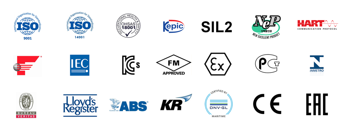 Certificado por estándares internacionales como SIL2, CE, FM, ATEX, IEC, DNV-GL, BV, LR, ABS, KR, EAC, Inmetro, KEPIC-EN, ISO9001, ISO14001, OHSAS18001, KCs..